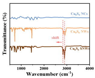 У ФТ-ИР спектру Цу9С5 СНЕ као што је приказано на Слици 3, примећен је значајан феномен црвеног померања у поређењу са Цу9С5 НВ, што указује на електронску интеракцију између Цу и С. Карактеристични пикови узорака Цу9С5 НВ и Цу9С5 СНЕ на 2916 цм-1 и цм-16 могу се приписати моду вибрирања на 284 цм. метилен (- ЦХ2-) у додеканетиолу, док карактеристичан пик на 1471 цм-1 одговара моду вибрације савијања Ц-Х везе.