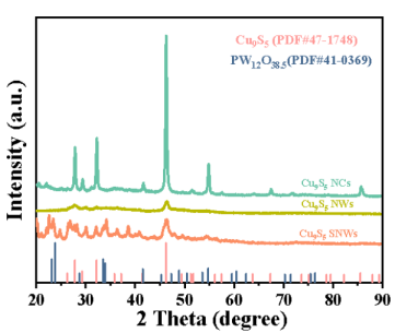 Половина ширине врха кристалне равни Цу9С5 СНВс (001) је значајно већа од ширине друга два облика узорака. Према Шереровој формули, што је мања величина зрна, већи је одговарајући дифракциони пик ширине половине врха. Напротив, што је већа величина честица, то је оштрија половина ширине дифракционог пика. Због величине поднанометарске скале (0,95 нм) узорка Цу9С5 СНВ и чињенице да узорак показује једноћелијску структуру без комплетне кристалне равни, ширина половине врха је значајно већа, док је (001) ширина пола врха Цу9С5 СНВс већа.