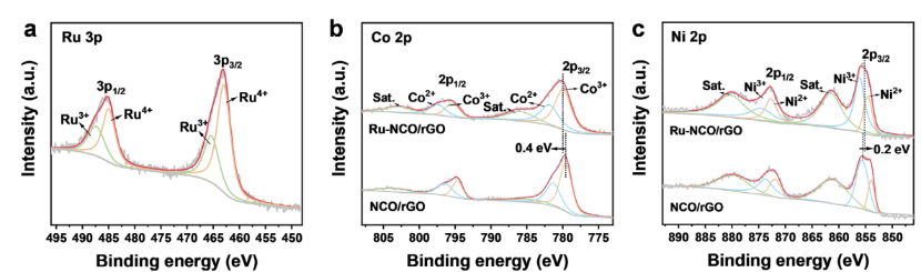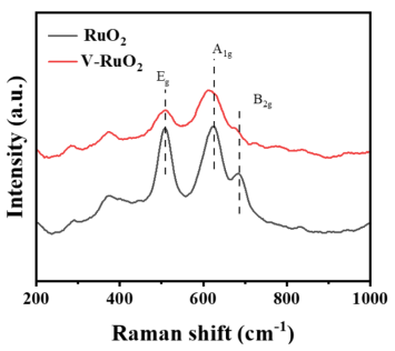 Као што је приказано на слици 4, Раманов спектар В-РуО2 (В-допирани РуО2) је конзистентан са спектром РуО2, без других јединствених пикова, искључујући стварање В2О5. В допинг помера А1г режим РуО2 на ниже таласне бројеве, што указује да увођење В значајно утиче на његову структуру решетке и окружење хемијског везивања (што може резултирати слободним местима за кисеоник или локалним дефектима), чиме се мења његова електронска структура; Лево померање А1г врха одражава интеракцију између В атома и РуО2 решетке, што указује да В допинг модулира локалну симетрију и карактеристике дужине везе РуО2.